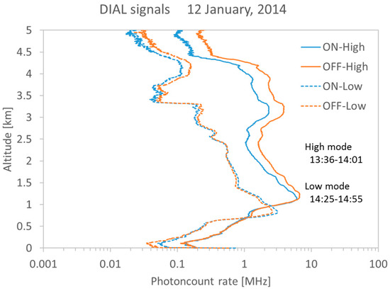 The CO2 DIAL system obtained the CO2 vertical mixing ratio profile for 1.5 to 3.5 km altitude from 13:36 to 14:55 LT on 12 January 2014. Figure 5 shows on-line and off-line return signals. The PMT signals are digitized by a LICEL transient recorder TR20-80 with 12 bit resolution, 20 MHz sampling rate equivalent to 7.5 m range resolution. Overlap altitudes are 0.8 km in the low-altitude mode and 1.1 km in the high-altitude mode. Rich aerosol backscattered signal is detected between 3 and 4 km altitude in the high-altitude mode, and is detected below 3.2 km altitude in the low-altitude mode. Figure 6 shows the comparison of DIAL data and aircraft (CRDS) data profiles (13:18 to 13:50 LT). The CRDS CO2 data were obtained from low altitude (0.5 km) to upper atmosphere (4.0 km). DIAL measurements were performed in the high-altitude mode from 13:36 to 14:01 LT and in the low-altitude mode from 14:25 to 14:55 LT. The optical density of the ND filter used in the low-altitude mode was 0.7. Vertical resolutions of the CO2 DIAL system were 236 m below 3 km and 590 m above 3 km. CO2 density obtained by DIAL measurement is calculated from Equation (1) and CO2 mixing ratio is obtained by air density calculated from temperature and pressure by a GPS sonde launched at 14:10 LT. The relative error of the DIAL data were calculated by Equation (2) and is shown as error bars in Figure 6. Table 2 shows the differences between CO2 mixing ratio derived from CO2 DIAL and aircraft measurements at various altitudes. The vertical resolution of CRDS measurements are adjusted to the CO2 DIAL measurements. In the low-altitude mode, the average relative error of the CO2 DIAL system was 1.91 ppm and the average difference between the values observed by the CO2 DIAL system and the aircraft sensor was −0.94 ± 1.91 ppm. In the high-altitude mode, the average relative error of the CO2 DIAL system was 1.98 ppm and the average difference between the values observed by the CO2 DIAL system and the aircraft sensor was −0.70 ± 1.98 ppm. The CO2 mixing ratio reported by aircraft observations were almost within the error bar of DIAL observations. The CO2 DIAL system is, therefore, capable of performing highly accurate vertical CO2 mixing ratio measurements.