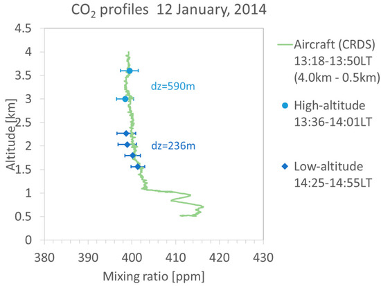 We have developed a 1.6 μm optical parametric generator (OPG)/optical parametric amplifier (OPA) transmitter and used it in a direct-detection DIAL system to measure CO2 mixing ratio profiles []. The 1.6 μm OPG/OPA transmitter system for the CO2 DIAL system is pumped by an iodine-based Q-switched Nd:YAG laser with a 500 Hz repetition rate. The optical receiver includes a near-infrared photomultiplier tube (PMT) with high quantum efficiency operating in the photon counting mode and a narrowband interference filter with a 1.0 nm full width at half maximum (FWHM) for daytime measurements. We conducted a field experiment at the Hino campus of Tokyo Metropolitan University to compare CO2 DIAL measurements with surface in situ sensor measurements to validate the DIAL measurements. An open-path CO2 gas analyzer (LICOR. Inc., LI-7500, Lincoln, NE, USA) is installed at the top of building at a height of 42 m. The CO2 DIAL is installed on the first floor of another building 110 m away from that building. The laser beam is irradiated directly over the gas analyzer. Data from the CO2 DIAL are acquired with a range resolution of 60 m and an integration time of five minutes. Data on the CO2 mixing ratio of the gas analyzer are acquired every one second. We found the difference between the CO2 mixing ratio measurements to be 0.06 ppm at 10 min average intervals []. As a next step, we conducted a field experiment to compare CO2 DIAL measurements with in situ sensor measurements on an aircraft to validate the vertical DIAL measurements. In this paper, we report a comparison of measurements of vertical distributions of CO2 mixing ratio by DIAL and the aircraft sensor.