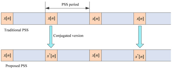 In the current LTE system, the synchronization signal is periodic, so we let the two PSS sequences in the adjacent period utilize the and , respectively, as shown in Figure 1. When the timing error caused by the frequency offset is small (for the device with an expensive crystal oscillator), it needs to search just one of the PSS signals rather than two for the purpose of a quick search, low complexity, and compatibility. In addition, it can maintain the peak-to-average power ratio (PAPR) property of the original sequence without the need of PAPR reduction techniques [12,13,14,15].
