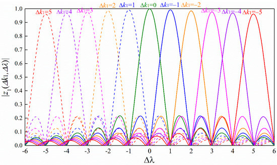 Illustration of the main lobes of the correlator output around the maximum frequency offset ( > 0 in this example). The dash line is the copy of the solid one with the same color.