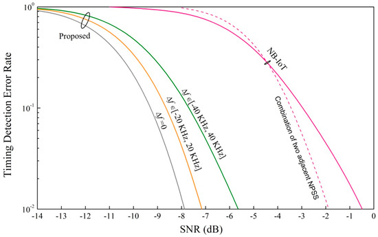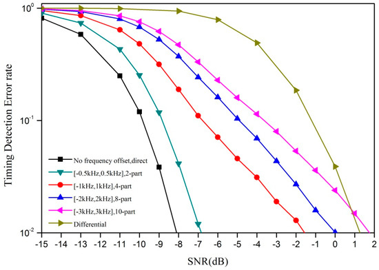 In this section, simulation results are given to verify the performance of our proposed PSS signal with a couple of ZC sequences which are conjugated. The system parameters are set as follows: the proposed PSS is generated in a time domain in the orthogonal frequency division multiplexing (OFDM) system, the subcarrier spacing is kHz, the length of ZC sequence is , the root of ZC sequence is , and the synchronization signal period is 10 ms (the same as the NPSS in NB-IoT [18]). In the simulation, the frequency offset is randomly and uniformly selected and added. The additive white Gaussian noise (AWGN) channel is used in the simulations. When the timing error is larger than 1 us, we regard it as detection error.