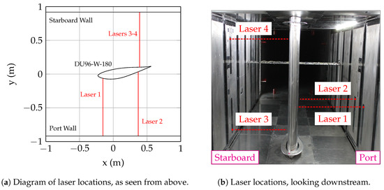 Figure 1 shows the Acuity AR700-32 units installed in the wall of the wind tunnel. Each sensor is held in place by an extruded aluminum mounting structure on the outside of the wind tunnel. The sensors are mounted flush with the wind tunnel wall, but are not rigidly attached to the wall, which ensures that the laser position is constant and is not affected by wall vibrations and/or deflections. The laser locations were chosen as to not interfere with other instrumentation installed in the wind tunnel walls, while also providing multiple measurements along the span (z) and chord (x) directions. The lasers are numbered for easy identification. Laser 1 is installed in the port wall, approximately 175 mm upstream of the model rotation point. Laser 2 is also installed in the port wall, but approximately 545 mm downstream of Laser 1. Lasers 1 and 2 are at the same span location in the tunnel, approximately 660 mm above the floor (z = −265 mm). Lasers 3 and 4 are installed in the starboard wind tunnel wall, at the same streamwise location as Laser 2. Laser 3 is close to the floor (approximately 200 mm from the floor, z = −725 mm), while Laser 4 is close the ceiling (1550 mm from the floor, z = 625 mm).