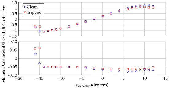 During a typical experimental measurement, the model is rotated through a series of angles of attack with the airflow set at a near-constant speed. At each measurement point, the turntable is locked to a set angle of attack. After the flow settles for 3–4 s, pressure transducers measure the pressure on approximately 90 pressure taps, distributed along the chordline of the model near midspan. After acquiring pressure data for 20–40 s, the model is rotated to the next angle of attack. This surface pressure can be integrated to calculate the lift coefficient () and the moment coefficient about the quarter chord point () [14]. Figure 2 shows the lift and moment coefficients as a function of angle of attack for the DU96-W-180 as measured in the VT SWT at a chord Reynolds number of 3.0 million (freestream air speed of ∼63 m/s). Two different configurations are shown here: clean and tripped. In the tripped configuration, a 0.4 mm tall zig-zag tape is placed near the leading edge of the model, which affects the growth of the boundary layer and changes the aerodynamic loads. By convention, a negative moment coefficients indicates that, if not constrained, the model would tend to rotate to a more negative angle of attack. Both the lift and moment coefficients change with angle of attack, which means that the aerodynamic loading on the model also changes with angle of attack.