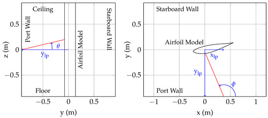Before the lasers can be used in a wind tunnel experiment, the position (and orientation) of the laser sensors needs to be determined. Once the orientation and position of the lasers is known, the laser readings can be used to track the location of the model within the test section. With the wind tunnel turned off (no air flow), the model was rotated between and angle of attack in increments. At each angle, the angle of attack (as measured by the encoder) and the laser distances are recorded. A simplex optimization routine was then used to calculate the laser positions/orientations (, , , and , as shown in Figure 3) that reproduce the encoder angle of attack for all of the measurements, assuming that the model’s rotation point is fixed in space.