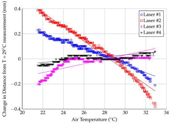 The temperature drift was accounted for by applying a linear regression to the results shown in Figure 4. The temperature shift data were offset such that the average shift at C was zero; C was chosen as the calibration temperature because the laser position calibration (described in the following subsection) was performed at this temperature. The parameters for the regression fits are shown in Table 1, while the regression is shown in Figure 4. The regression lines do not track the temperature drift across the entire temperature range, so there is added uncertainty in the measurement after considering the temperature drift. The maximum difference between the data points shown in Figure 1 and the regression line is shown in Table 1; this value is added to the uncertainty based on the resolution of the measurement when considering the total uncertainty in the measured distance for the remaining calculations in this paper.