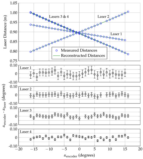 Results from this calibration are shown in Figure 5. The calculated laser positions/orientations (shown in Table 2) are consistent with the positions/orientations of the lasers in the wind tunnel. The top plot in Figure 5 shows the measured laser distance for all four lasers as a function of angle of attack, while the remaining four plots show the calibration residuals (the difference between encoder angle of attack and the reconstructed laser angle of attack, using the recorded distance and the calibration constants.)