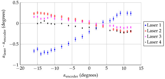Once the laser positions/orientations were calculated, the sensors were used to track model angle of attack during a wind-on measurement, as described in Section 2.2. For this analysis, the center of rotation was assumed to not move during the test, but the model could rotate/twist under aerodynamic load. The difference between the encoder angle of attack and the calculated angle of attack from the lasers is shown in Figure 6. Lasers 2–4 (which are downstream of the model rotation point) show a difference in angle of attack that becomes more negative as the lift is increased. In contrast, Laser 1 (which is closer to and upstream of the model rotation point) shows the opposite trend. The discrepancy between Laser 1 and Lasers 2–4 is an order of magnitude larger than the uncertainty in the measurement, and indicates that the model is not uniformly rotating, but deforming in a more complex way. The model could be shifting or bending, which would move the model rotation point as a function along the span.