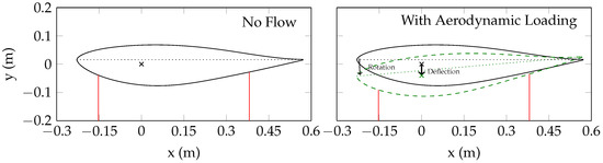 Figure 9 shows the deflection calculated using the distances calculated from Lasers 1 and 2. Figure 2 shows that there is zero lift force on the model near angle of attack; however, Lasers 1 and 2 showed a wide range of deflections at this angle, from −0.65 mm to 0.73 mm. This suggests that there might be some small shifts in model position over time. For this plot, the zero lift deflection was subtracted out to show the deflection relative to the zero lift deflection. At this spanwise location (660 mm above the floor), the model deflects up to 1.5 mm in the direction of the applied lift. The deflection is a linear function of the load in the linear region of the lift curve, from to . This deflection explains why Figure 6 shows discrepancies between the laser outputs; the model rotation point is not fixed in space, and multiple lasers need to be used to calculate the model angle of attack.