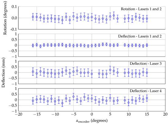 As expected, the rotation and deflections were zero within the uncertainty of the calculation. The uncertainty in the rotation was degrees, and the uncertainty in the deflection calculated by Lasers 1 and 2 was mm. The uncertainty associated with the deflection measured by Lasers 3 and 4 was mm; the uncertainty for these calculations is larger because of the added uncertainty in calculating the model rotation (which is then used to calculate the deflections measured by Lasers 3 and 4.)