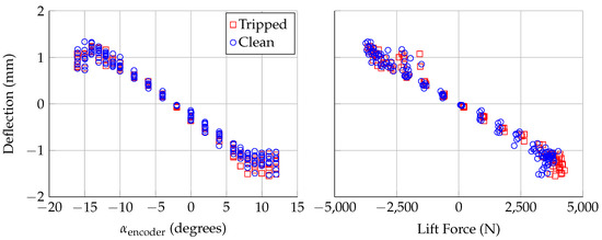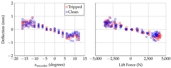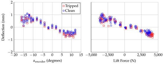 Deflection at span position of Laser 4, assuming no twist, plotted against: encoder angle of attack (left); and aerodynamic lift force (right). Uncertainty in deflection is mm.