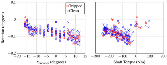 Figure 10 shows the rotation calculated by Lasers 1 and 2, as a function of the the encoder angle of attack and the applied torque on the model shaft. The model rotation is approximately 0 at the most negative angle of attack, when the shaft torque is near-zero or slightly positive. As the angle of attack is increased, to , there is a large shift in shaft torque to approximately −250 Nm, and the model undergoes a slight negative rotation. As the angle of attack is increased further, the magnitude of the negative rotation increases, to approximately at the largest angles of attack. The relationship between the shaft torque and rotation shown in Figure 10 was not anticipated; the expectation was that more negative shaft torques would create larger negative rotations. The torque/rotation points show the opposite trend, but it should be noted that the uncertainty in the rotation is .