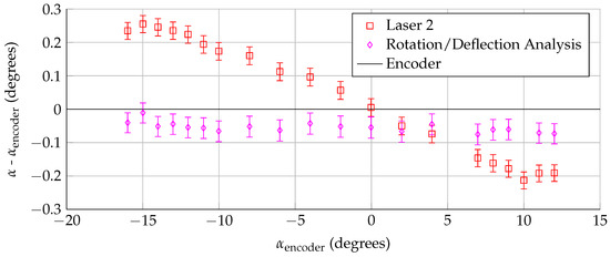 Finally, Figure 13 shows the rotation/deflection analysis for the same dataset shown in Figure 6. The figure shows the difference between the angle of attack measured by the encoder and two methods discussed in this paper: using a single laser while assuming that the center of rotation is fixed, and using multiple lasers at the same span location to account for model bending/translation. The multiple-laser technique shows that the model rotates slightly under loading, creating an approximately offset in the angle of attack. This technique also showed a small amount of model bending (<2 mm). Previous studies with this model [12,13] have shown that boundary layer transition and other aerodynamic qualities do not vary in the span (z) direction, which suggests that this model bending does not affect the model aerodynamics. However, the bending is enough to bias the single laser angle of attack measurement. For example: at encoder angle of attack, using only Laser 2 to calculate the angle of attack (while assuming that the center of rotation point is fixed) leads to an angle of attack measurement of . When Lasers 1 and 2 are used simultaneously to remove bending effects, the angle of attack measurement is . This shows that the bias caused by model bending can be even larger than the measured rotation, and multiple lasers should be used to accurately measure the angle of attack.