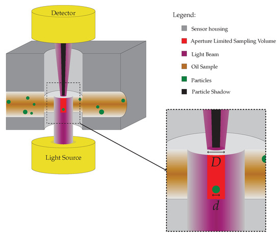 The working principle of a typical OPC based on light extinction is shown in Figure 1, where it is illustrated how a particle present in the sampling volume causes a shadow to be projected onto the detector located opposite to the light source. The sampling volume is defined by the aperture diameter, light source divergence and flow channel width, which for the case shown in Figure 1 yields a cylindrical volume, due to the assumption of a non-diverging light source. Certain particles will be present in the sampling volume, as they move with the laminar, unidirectional oil flow from sensor inlet to outlet.