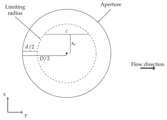 The limiting radius, illustrated in Figure 2, indicates the maximum distance a particle can be placed from aperture center and still be completely sampled, i.e., a spherical particle with its center positioned within the limiting radius will result in the particle being completely sampled, while particles positioned outside this radius will result in the sampled particle appearing smaller than it really is, corresponding to the overlap area between aperture and particle, , being smaller than the particle cross-sectional area. Assuming uniformly distributed particles and a unidirectional flow along the y-axis, the probability of obtaining a complete sample becomes a relation between c and the sampling length . c is displayed in Figure 2 and denotes the length of the aperture chord at the particle position in the x-range (x), while is the length traversed by a particle between sampling moments, thus relating to detector sampling frequency and flow velocity of the medium in which the particles are immersed. For values of x where a complete sample is ensured, but for x-values between c and the limiting radius the probability of obtaining a complete sample is given by the probability function in Equation (4), which takes into account the dimensions of both particle and aperture as well as the sampling frequency and flow velocity (in terms of ):