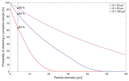 Theoretical curves for the probability of obtaining a complete sample for three detector aperture diameters (D = 25, 50 and 100 ) as a function of particle diameter. The probability of obtaining a complete sample when (dashed line) is displayed in the plot for the three different aperture sizes, since it constitutes the current lower detection limit of optical particle counters (OPCs).