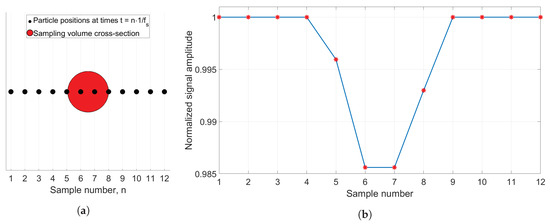 Plot showing the simulation concept by using an aperture and particle diameter of 50 and 6 , respectively. (a) particle position at the different sample times, where subsequent samples are apart; (b) normalized output signal, corresponding to the case shown in (a).