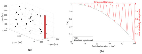 (a) a defined oil volume with a number of uniformly distributed particles; (b) verification that the normalized simulation output follows the theoretical derivation of the transmission factor T, through sampling of 10 different-sized particles (red solid line) and comparing with the calculated transmission factor, T, as a function of particle diameter (black dashed).