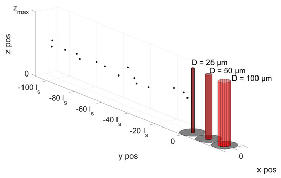 In order to investigate the influence of particles not being completely enclosed by the aperture when being sampled, the particle-contaminated oil volume is defined such that the distance between subsequent particles in the flow direction is large enough for them not to be sampled simultaneously, while a uniform probability function is used as governance for defining particle placement in the direction perpendicular to both flow and optical path (see Figure 7). A total of six simulations are conducted for two different particle-contaminated oil volumes, where the volumes differ in the size of the defined particles. For each oil volume, the corresponding signal amplitude of a 25 , 50 and 100 diameter aperture is calculated as it passes by. In practice, this will correspond to the situation illustrated in Figure 7 where three apertures are placed in series, and their corresponding outputs relate to the same particle-contaminated oil volume, shifted in time by an amount proportional to the distance between them. The two volumes used for simulation both consist of 20,000 equally-sized particles, which are positioned in an -plane at a fixed z-position. One volume contains only 4 diameter particles, while the other contains only particles with a size of 50 in diameter. The following rules have been defined for the x- and y-positions of the particles: