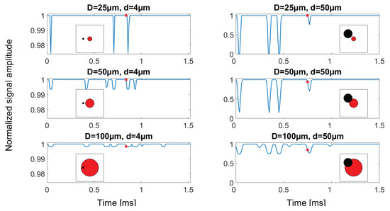 A sequence of the six simulated signals, with inserts showing the particle and aperture position at the sample time indicated by the red *. The vertical axis limits are different for the two particle sizes, in order to be able to compare the output levels for aperture sizes in the case of .
