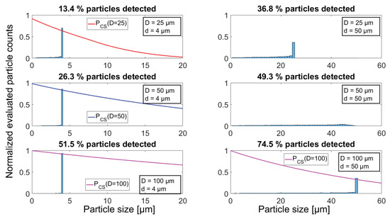 Normalized histogram presentation of the detected particles when using three different aperture sizes. The left column shows how the evaluated size of 4 diameter particles are distributed using different aperture sizes, while the right column represents the size evaluation of 50 diameter particles. The used bin width in all histograms are chosen for best visual presentation of the results. Theoretical probabilities for obtaining a complete sample as a function of particle diameter were introduced in Figure 2, and are recreated in the left column and bottom right (red, blue and magenta lines) for comparing simulated and theoretical results.