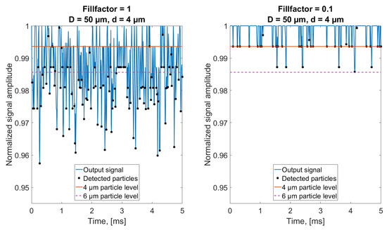 Simulated signal outputs for the case of 4 diameter particles and a Fillfactor of 1 (left) and 0.1 (right). The black markers represent the local minima detected by the algorithm. The minimum amplitudes are converted into corresponding detected particle sizes. A solid red line and a magenta dashed line has been inserted for illustrating the output signal value corresponding to a 4 and 6 particle, respectively, if fully enclosed by the sampling volume.