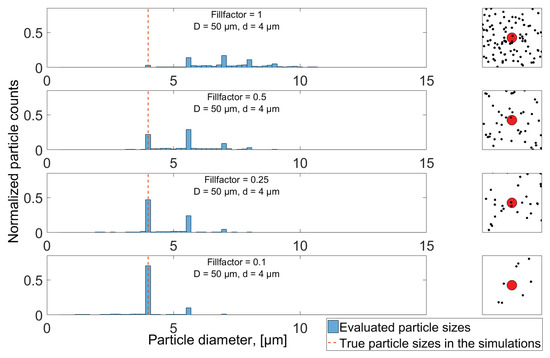 As Section 6.1 involved an investigation of how the presence of a particle in the sampling volume might result in a smaller signal amplitude than expected, if sampled incorrectly, this section deals with the possibility of two or more particles being sampled simultaneously and erroneously being interpreted as a single, larger, particle. A 50 aperture is used for sampling different concentrations of either 4 or 50 particles, uniformly distributed in a volume. The uniform distribution will both lead to the possibility of two particles being sampled simultaneously, but also to a single particle being incompletely sampled, as has been investigated earlier. As a starting point, a total particle volume of / is initially defined as Fillfactor = 1. The fillfactor will serve as a dimensionless factor that is altered between simulations. The initial total particle volume and the Fillfactor can be used to calculate the number of particles per mL, by dividing their product with the volume of a single spherical particle, as given by Equation (6):
