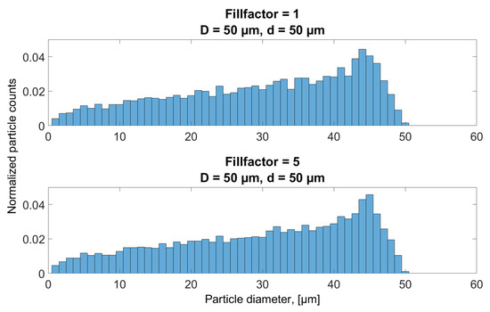 Figure 11 shows that, for the high concentration (Fillfactor = 1), only a small fraction of detected particle is evaluated to be 4 in size, while a higher number appears to be 2, 3, 4 and 5 times the area of a single 4 particle, implying a higher probability of sampling two or more particles completely at the same time than obtaining a complete sample for just one particle. The samples resulting in size evaluation somewhere in between these peaks is a result of at least one particle being incompletely sampled, when multiple particles intercept with the sampling volume. As the concentration is reduced, more particles are evaluated having their correct size and, as a result, less particles are wrongfully evaluated as larger particles. Additionally, as the concentration reduces, a number of particles is also sampled as smaller than 4 , which is a direct result of incomplete sampling, as discussed in Section 3.1 and Section 6.1. Thus, the maximum height of the histogram bars at 4 in all plots of Figure 11 is ultimately limited by the probability of obtaining a complete sample of a single particle, resulting from the circular aperture shape and uniform distribution of particles throughout the volume. The result when sampling different concentrations of 50 particles is shown in Figure 12, where, instead of reducing the Fillfactor, it has been increased from 1 to 5. Since the 50 diameter aperture has been used for the simulations, no particles will be evaluated as larger than this, and, as was seen in Section 3.1, there is a vanishing small probability of obtaining a complete sample. Figure 12 shows two nearly identical histograms of evaluated size evaluations of the two concentration levels, even though the particle density in the oil volume on the lower plot is five times that displayed in the upper. The two distributions are left skewed, and are comparable in terms of shape and magnitude with the results in Figure 9 in Section 6.1 when investigating incomplete sampling of 50 particles through a 50 aperture shown.