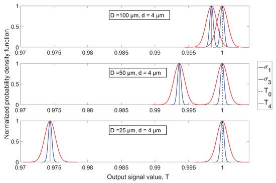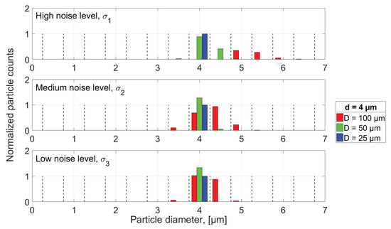 An intrinsic part of particle sampling is optical and electrical noise disturbing the measurements. To investigate the influence of noise, three different noise levels are added to the simulated ideal signals. Three aperture diameters are used (25, 50 and 100 ) while only 4 particles are investigated, since the smaller SNR for this particle size, compared to larger ones, will yield a larger measurement uncertainty due to the influence of noise. The added noise is assumed normally distributed and fully described through its mean and variance. The chosen noise amplitudes are defined in terms of the theoretical signal level for a 4 particle fully enclosed by a 100 aperture, by setting the intersection of noise density functions around this theoretical level and the level of no particle overlap (T) equal to 1, 2 and 3 standard deviations of the normal distribution. The distributions are shown in Figure 13 for three different aperture diameters and two different noise amplitudes, where the solid red and blue lines represent the high noise level () and low noise level (), respectively. The width of the distributions are equal for all three aperture diameters, and measurement noise is thereby assumed independent of incident optical power on the detector. As a result, the only difference between aperture choice is the signal amplitude when a 4 diameter particle is fully enclosed by the aperture (T), which leads to different SNRs. The rather simple design of the particle detection algorithm explained in Section 5 would result in a lot of samples around being wrongfully interpreted as small particles. A threshold of 3 is therefore introduced, meaning that a sample value must exceed this threshold in order for it to be evaluated as a particle-induced sample. For the case of D = 100 and a high noise level (), a 4 diameter particle would theoretically imply a signal amplitude two standard deviations away from T, and the threshold definition therefore results in 4 particles being undetectable through a 100 diameter aperture. To avert the influence of incomplete sampling and multiple particles being detected simultaneously, as was investigated in Section 6.1 and Section 6.2, respectively, the simulated particles are defined equidistant in the flow direction with a distance between them large enough for them not to contribute to the overlapping area at the same time. Additionally, all particles are assured to pass the aperture centre, so a minimum of one complete sample is obtained for all particles. 2 signal sequences for the three different aperture diameters are shown in Figure 14 where the medium noise level () has been added to the simulated signal resulting from sampling 4 diameter particles. Figure 14 shows that noise influence is most dominant when using a 100 aperture, as is expected because of the lower SNR compared to using smaller aperture diameters. The full length signals for all three noise levels and aperture diameters are processed by the algorithm, and the simulated detection results are shown in the histograms of Figure 15.