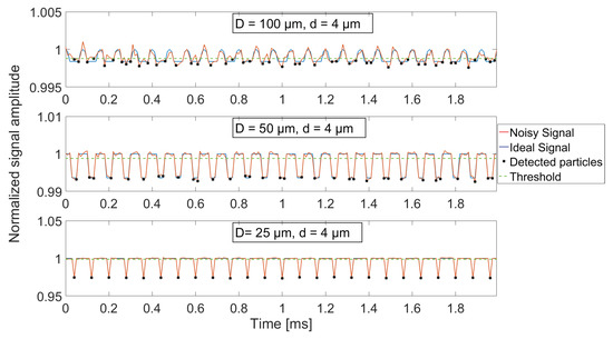2 signal sequences of both ideal (blue) and noisy (red) signal outputs, for aperture diameters of 100 (upper), 50 (middle) and 25 (lower) where 4 diameter particles are simulated and a medium noise level () has been added to construct the noisy signal. Samples below the 3 threshold (green dashed line) where the algorithm has detected a particle are highlighted with black markers.