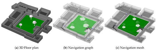 - Van Toll, W.; Cook, A.F.; Geraerts, R. Navigation Meshes for Realistic Multi-Layered Environments. In Proceedings of the 2011 IEEE/RSJ International Conference on Intelligent Robots and Systems (IROS), San Francisco, CA, USA, 25–30 September 2011; pp. 3526–3532. [Google Scholar]