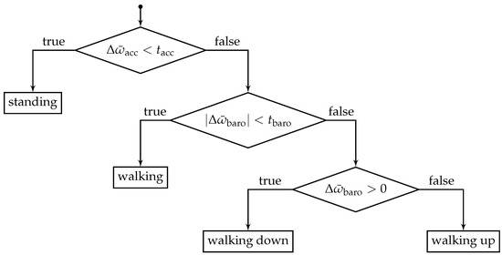 Decision tree describing the threshold-based activity recognition using the smartphone’s barometer and accelerometer measurements. The respective thresholds are given by and . For each sensor the sigma of the arithmetic mean of two different fix-sized windows (short) and (long), holding a set of the most current sensor measurements, is calculated. The process updates with every incoming barometer reading.