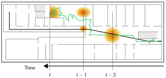 An example of the occurrence of sample impoverishment enhanced by a restrictive transition model that prevents sampling through walls. At time the approximated position (green line) drifts apart from the ground truth (black line) due to uncertain measurements. The posterior distribution is then captured within the room and not able to recover by itself [3].