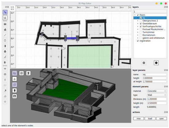 The building consists of 6 different levels, which are grouped into 3 floors. Thus, the ceiling height is not constant over one floor and varies between 2.6 m to 3.6 m. While most of the exterior and ground level walls are made of massive stones, the floors above are half-timbered constructions. In the middle of the building is an outdoor area, which is only accessible from one side. The total walkable indoor area for a visitor is 2500 m2 in size. Due to objects like exhibits, cabinets or signs not all positions within the building were freely accessible. For the sake of simplicity we did not incorporate such knowledge into the floor plan. Thus, the floor plan consists only of walls, ceilings, doors, windows and stairs. It was created using our 3D map editor software (see Figure 4) based on architectural drawings from the 1980s. Our map editor is also used to automatically create the navigation mesh, which only takes a few seconds to compute.