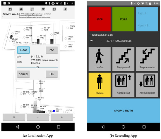 Most smartphone-based systems for indoor localization are using received signal strength indications (RSSI) given by Wi-Fi or Bluetooth as a source for absolute positioning information. At this, one can mainly distinguish between fingerprinting and signal strength prediction model based solutions [6]. Indoor localization using Wi-Fi fingerprints was first addressed by [27]. During a one-time offline-phase, a multitude of reference measurements are conducted. During the online-phase the pedestrian’s location is then inferred by comparing those prior measurements against live readings. Based on this pioneering work, many further improvements where made within this field of research [28,29,30]. However, despite a very high accuracy up to 1 , classic fingerprinting approaches suffer from tremendous setup- and maintenance times. For this reason, some alternative approaches were presented to speed up the offline-phase. In [31] the positions of recorded references are interpolated between the start and end of some reference path, based on the pedestrians gait cycle. Unrecorded positions are then obtained using the flood fill algorithm. However, for old buildings with many nooks and crannies this might cause problems as the RSSI can differ highly within a few meter, especially in the entrance area of thick-walled rooms. This could open the need for more advanced map interpolation methods or a higher number and density of reference paths to walk. Another often considered alternative is using robots instead of human workforce [32,33], still this seems not to be a valid option for old buildings with limited accessibility for robots due to uneven grounds and small stairs.