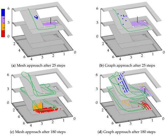 The same applies for an accuracy comparison between the graph-based model and the navigation mesh as part of the overall system. Both provide very similar localization errors regarding the conducted walks. This is not a big surprise, as the accuracy of the pedestrian’s position based on the estimated state and thus the complete posterior density (weighted particle set). It is obvious, that choosing a graph with a grid-size of e.g., 2 × 2 m would worsen the results. This leads to the statement, that the approximation error of walking alongside the edges of a (reasonable sized) gridded graph is small enough that it has no significant influence on the overall localization accuracy compared to a true continuous motion. Nevertheless, as shown in Section 7.1, the navigation mesh offers several major benefits by highly reducing the memory footprint.