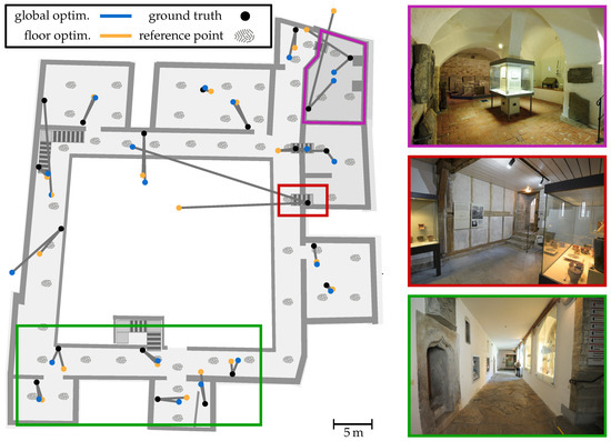 As described in Section 5.1 we used 42 WEMOS D1 mini to provide a Wi-Fi signal coverage throughout the building. The distribution of the beacons on ground floor can be seen in Figure 7 (black dots) as well as the references (fingerprints) for optimization. The position of the beacons were chosen depending on available power sources. Care was taken to have at least two beacons in each room and a third beacon visible in an approximate radius of 10 m. Due to the difficult architecture and the extremely thick walls of the museum, we decided on this procedure, which explains the rather large number of 42 transmitters compared to modern buildings. Another reason for the high number of beacons is that we did not want to analyze the quality of the Wi-Fi signal coverage for further improvements, as this can be a very time-consuming task. In many areas of the building an improvement would not even be possible due to the lack of power sockets. The power sockets are located at different heights ranging from 0.2 m to 2.5 m. Consequently, there were no prior requirements on how a single beacon should be placed exactly and its position is dictated by the socket’s position. Considering all the above, the beacons were placed more or less freely and to the best of our knowledge.