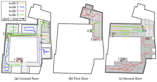 All conducted walks within the building. The arrows indicate the running direction and a cross marks the end. For a better overview we have divided the building into three floors, which are connected by four stairs (numbered 1–4). However, each floor consists of different high levels. They are separated from each other by different shades of grey, dark is lower than light.