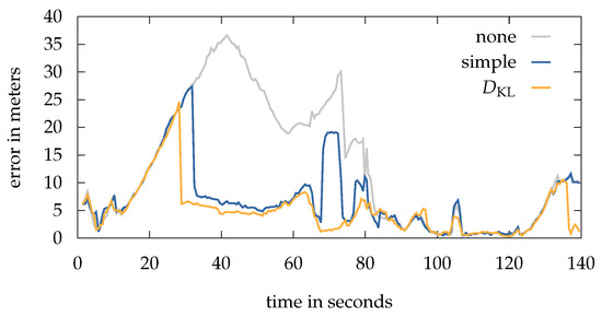 All walks, except for walk 1, suffer in some way from sample impoverishment. We discuss the single results of Table 1 starting with walk 0. Here, the pedestrians started at the top most level, walking down to the lowest point of the building. The first critical situation occurs immediately after the start. While walking down the small staircase, many particles are getting dragged into the room to the right due to erroneous Wi-Fi readings. At this point, the activity “walking down” is recognized, however only for a very short period. This is caused by the short length of the stairs. After this period, only a small number of particles changed the floor correctly, while a majority is stuck within the right-hand room. The activity based evaluation prevents particles from further walking down the stairs, while the resampling step mainly draws particles in already populated areas. In 10% of the runs using none of the anti-impoverishment methods, the system is unable to recover and thus unable to finish the walk somewhere near the correct position or even on the same floor. Yet, the other 90% of runs suffer from a very high error. Only by using one of the here presented methods to prevent impoverishment, the system is able to recover in 100% of cases. Figure 9 compares the error over time between the different methods for an exemplary run. The above described situation, causing the system to stuck after 10 , is clearly visible. Both, the simple and the method are able to recover early and thus decrease the overall error dramatically. Between 65 and 74 the simple method produces high errors due to some uncertain Wi-Fi measurements coming from an access point below, causing those particles who are randomly drawn near this AP to be rewarded with a very high weight. This leads to newly sampled particles in this area and therefore a jump of the estimation. The situation is resolved after entering another room, which is now shielded by stone walls instead of wooden ones. Walking down the stairs at 80 does also recover the localization system using none of the methods.
