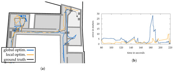 (a) A small section of walk 3. Optimizing the system with a global Wi-Fi optimization scheme (blue) causes a big jump and thus high errors. This happens due to highly attenuated Wi-Fi signals and inappropriate Wi-Fi parameters. We compare this to a system optimized for each floor individually (orange), resolving the situation a producing reasonable results; (b) Error development over time for this section. The high error can be seen at 190 .