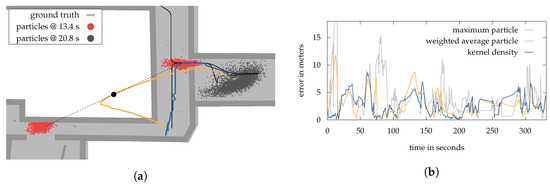 The main advantage of a KDE-based estimation is that it provides the “correct” mode of a density, even under a multimodal setting (cf. Section 6.1). That is why we again have a look at walk 1. A situation in which the system highly benefits from this is illustrated in Figure 11a. Here, a set of particles splits apart, due to uncertain measurements and multiple possible walking directions. Indicated by the black dotted line, the resulting bimodal posterior reaches its maximum distance between the modes at . Thus, a weighted-average estimation (orange line) results in a position of the pedestrian somewhere outside the building (light green area). The ground truth is given by the black solid line. The KDE-based estimation (blue line) is able to provide reasonable results by choosing the “correct” mode of the density. After the setting returns to be unimodal again. Due to a right turn the lower red particles are walking against a wall and thus punished with a low weight.
