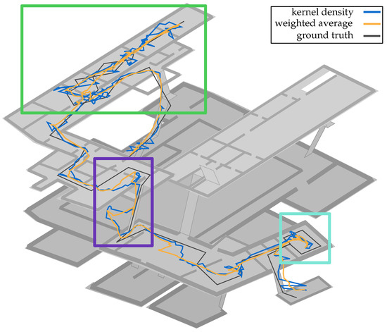 This leads to the conclusion, that a weighted-average approach provides a more smooth representation of the estimated locations and thus a higher robustness. A comparison between both methods is illustrated in Figure 12 using a measuring sequence of walk 2. We have highlighted some interesting areas with colored rectangles. The greatest difference between the respective estimation methods can be seen inside the green rectangle, the gallery wing of the museum. While the weighted-average (orange) produces a very straight estimated path, the KDE-based method (blue) is much more volatile. This can be explained by the many small rooms that pedestrians pass through. The doors act like bottlenecks, which is why many particles run against walls and thus are either drawn on a new position within a reachable area (cf. Section 6.1) or walk along the wall towards the door. This causes a higher uncertainty and diversity of the posterior, what is more likely to be reflected by the KDE method than by the weighted-average. Additionally, the pedestrian was forced seven times to look at paintings (stop walking) between 10 and 20 , just in this small area. Nevertheless, even if both estimated paths look very different, they produce similar errors.