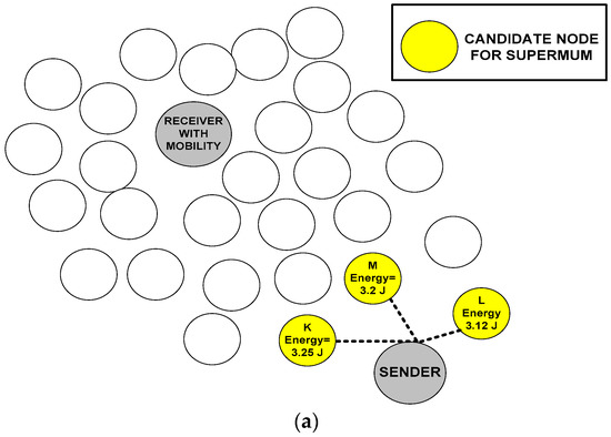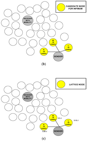 (a) Selection of the supremum node based on the highest residual energy using the upper bound. (b) Selection of the infimum node based on the shortest distance using the greatest lower bound. (c) Selection of the lattice node based on the shortest distance and highest residual energy using greatest lower bound and upper bound, respectively (satisfying both conditions of supremum and infimum).