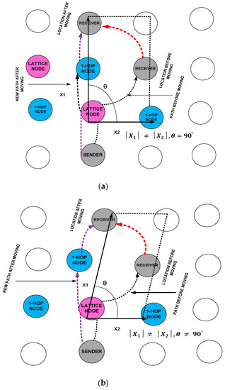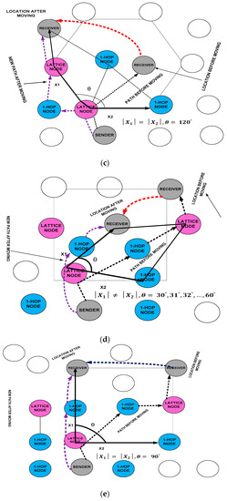 The rhombic is the type of Bravais lattice that can be used to find the location of a mobile sensor node when its trajectory is between and . Hence, the new location of mobile sensor node is obtained by using the following integrands, and the trajectory of the mobile sensor node is depicted in Figure 3d: