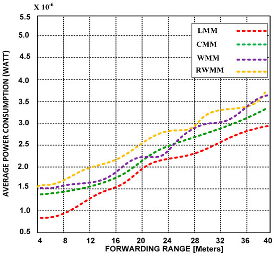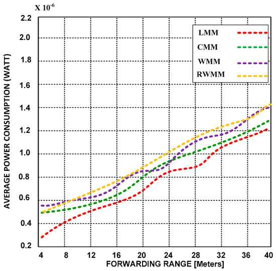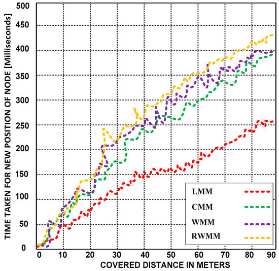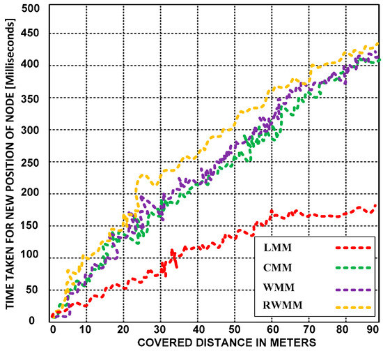 Here, we examine the compatibility of the LMM with sensor nodes. Based on the simulation results, we analyze the time taken for each moving node to reach different positions. We also compare the efficiency of the LMM with the CMM, WMM, and RWMM. Figure 8 presents the distances covered by the sensor nodes using the LMM and the other mobility models.