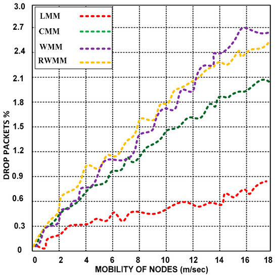 Figure 10 compares the packet drop rate of the LMM with those of the CMM, RWMM, and WMM. The LMM outperforms the other mobility models in walking patterns; it drops a maximum of 0.7% of the packets, whereas the other mobility models have dropped rates as high as 2.45%. This result confirms the high potential of the LMM as a mobility model for walking patterns.
