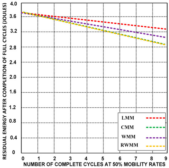 The residual energy of the LMM decreases from 0.12 to 0.38 Joules at 10%, 25% and 50% mobility rates, which is a smaller decrease equivalent to 10.27% after completion of nine cycles than for the other mobility models. The energy levels of the other mobility models decrease from 0.28 to 0.756 Joules after completing ten motion cycles (the completion of event monitoring), which is equivalent to 20.27%. It is almost a double energy consumption waste.