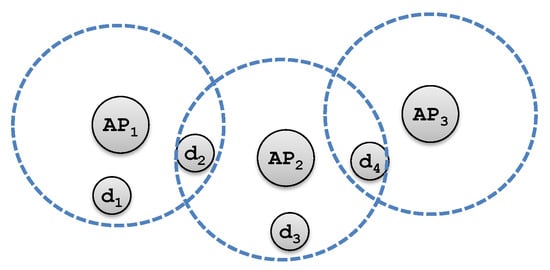 Association control is also explored in other types of networks, such Wireless Mesh Networks (WMN) [], Multiple Input Multiple Output (MIMO) networks [] and cellular networks []. Furthermore, some researchers considered the dynamics and mobility in WLANs. In [], Wong et al. suggested re-associating users among neighboring APs when the AP capacity constraints are violated due to the evolving network and users’ movements.
