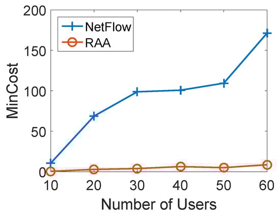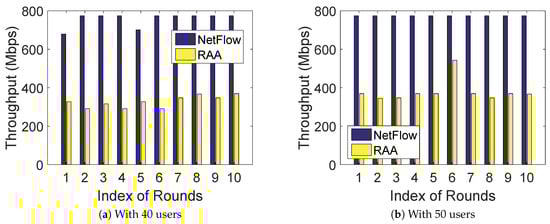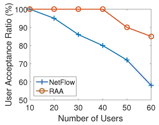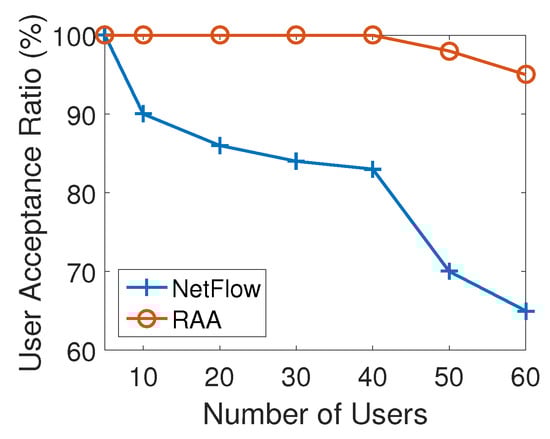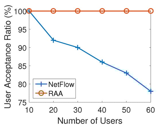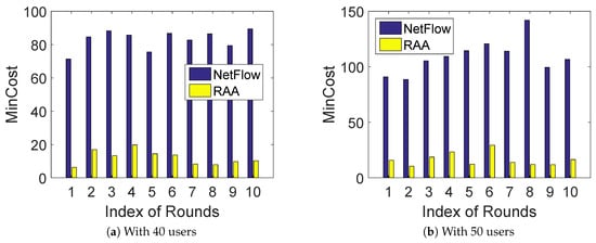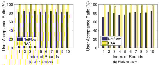 Figure 4a,b presents the user acceptance ratio results for both algorithms when the number of m users was fixed with 40 and 50, respectively. When the number of users was 40, we can see in Figure 4a that our RAA algorithm achieved user acceptance ratio in eight rounds and in the remaining two rounds. When the number of users was 50, Figure 4b shows that our algorithm achieved almost user acceptance ratio in every round, while the NetFlow algorithm could only achieve around user acceptance ratio. Overall, our algorithm performed much better in the aspect of user acceptance ratio.