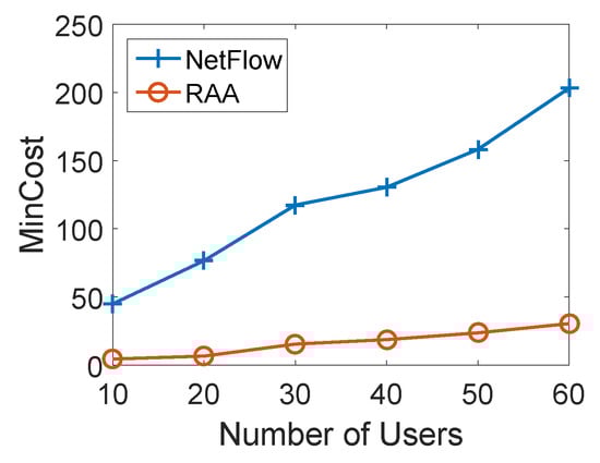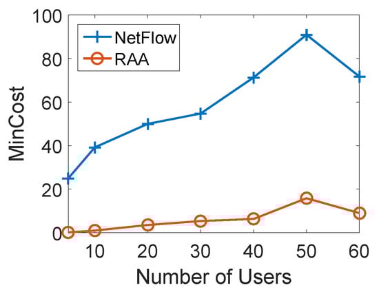 We studied the impact of the number of users for both algorithms. We first fixed the number of APs as 10 and gradually increased the number of user devices from 5 to 60 to compare the total min-cost and user acceptance ratio between two algorithms. For each load, we ran both algorithms 10 times with the fixed number of mobile users to get the average results. Figure 5 depicts the result of the average total min-cost for both algorithms as the number of users varies from 10 to 60 with an increment of 10. When the number of users was 40, the average min-cost of the NetFlow algorithm was 71.35, while it was only 6.29 for our RAA algorithm. From the curves in Figure 5, we can see that the cost of our algorithm gradually increased while the cost of the NetFlow algorithm grew sharply when the number of users increased.