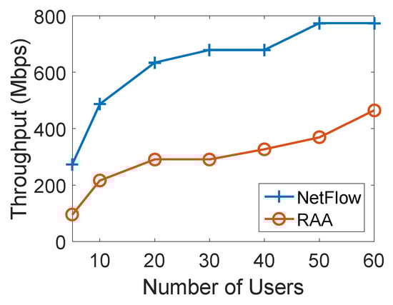 Figure 6 presents how the average user acceptance ratio produced by RAA and NetFlow algorithms change when the number of users increased from 5 to 60 with an increment of 10. As the number of users increased, the user acceptance ratio from both algorithms decreased. This result is consistent with the expectation that there will be some users that will not be able to be associated since the capacities of APs are limited. However, from the result of Figure 6, our RAA algorithm accepted many more users as the number of users increases. In addition, our algorithm’s user acceptance ratio dropped very slowly as the number of users increases, while the NetFlow algorithm’s result droped sharply. When the number of users reached 60, the user acceptance ratio from NetFlow algorithm has dropped to while the RAA algorithm’s ratio could still be . Figure 7 presents the throughput generated by both algorithms. This result also shows that our algorithm produced much less throughput which induces the less cost as shown in Figure 5.